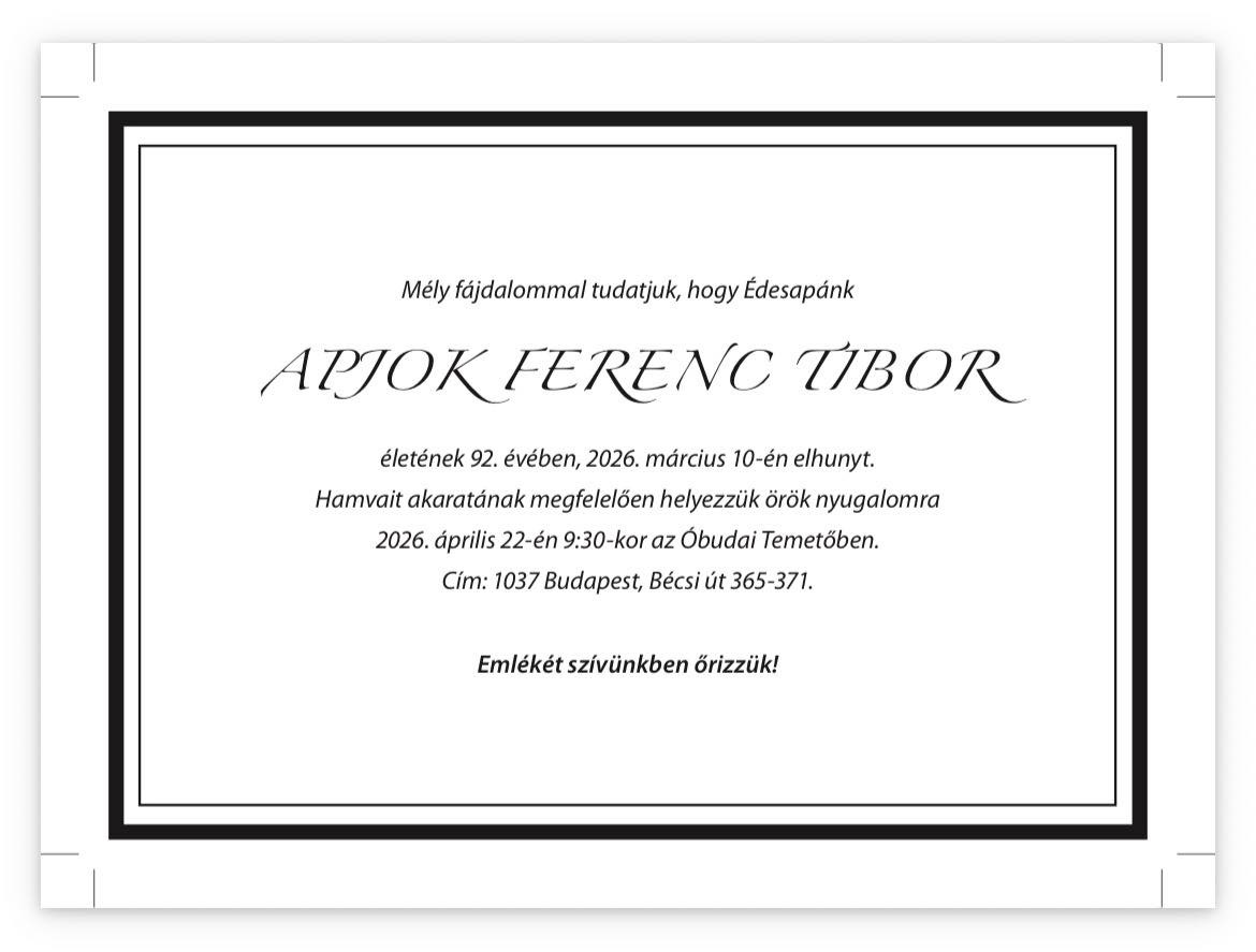 Életének 92. évében március 10-én elhunyt Apjok Ferenc.